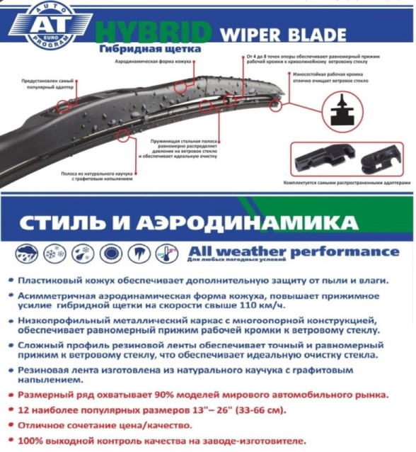 Щетки стеклоочистителя гибридные AT Hybrid – стиль и аэродинамика. Особенность конструкции этого типа щеток – это объединение классического каркаса с системой коромысел и шарниров (как в каркасных щетках) и пластикового кожуха – спойлера. Причем каркас выполнен максимально компактно, благодаря чему помещается под невысоким кожухом, имеет оригинальный внешний вид. Наличие каркаса обеспечивает оптимальный многоточечный прижим щетки по всей длине к стеклу любого профиля, что делает стеклоочистители данного типа универсальными. Пластиковый кожух обеспечивает дополнительную защиту от пыли и влаги, а благодаря аэродинамической конструкции, выступает в роли спойлера и повышает прижимное усилие на высоких скоростях.